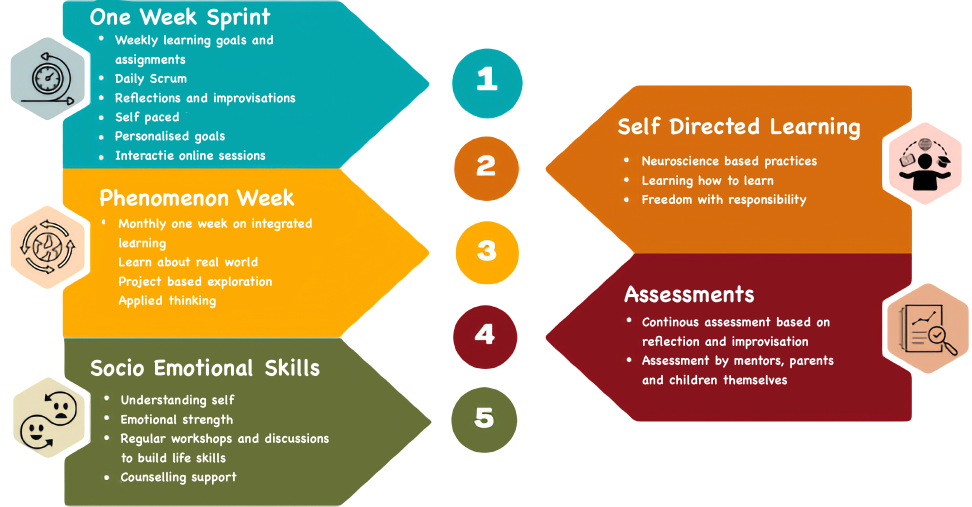 At Agile Shaala, learning follows a dynamic cycle. Children plan their goals using agile tools, have personalised learning experiences, explore through hands-on activities and grow through continous feedback.